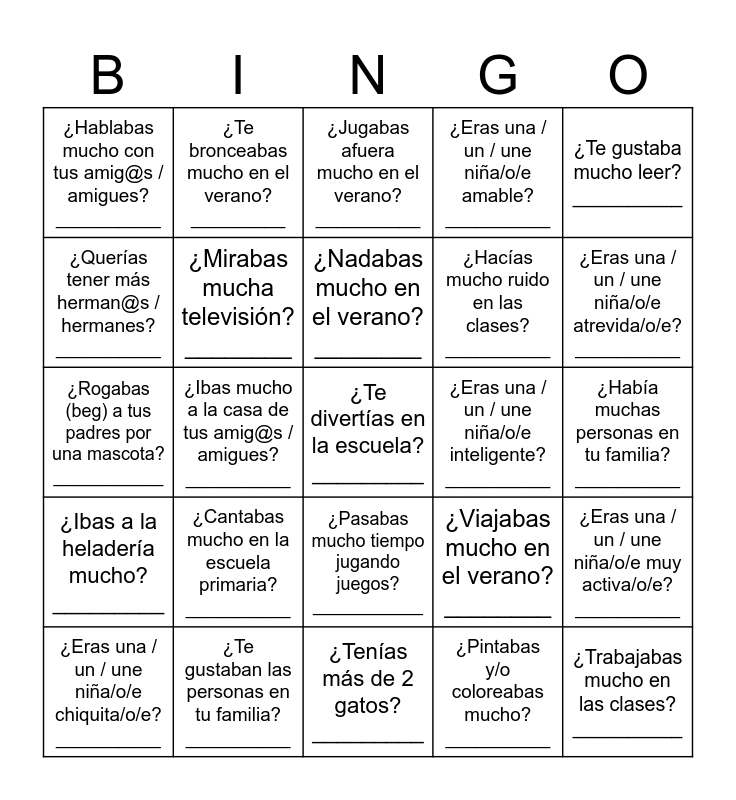 This bingo card has 25 words: ¿Cantabas mucho en la escuela primaria? __________, ¿Tenías más de 2 gatos? _________, ¿Nadabas mucho en el verano? ________, ¿Eras una / un / une niña/o/e chiquita/o/e? __________, ¿Te gustaba mucho leer? __________, ¿Hablabas mucho con tus amig@s / amigues? __________, ¿Querías tener más herman@s / hermanes? __________, ¿Te bronceabas mucho en el verano? _________, ¿Eras una / un / une niña/o/e inteligente? __________, ¿Pasabas mucho tiempo jugando juegos? ___________, ¿Hacías mucho ruido en las clases? __________, ¿Rogabas (beg) a tus padres por una mascota? ___________, ¿Viajabas mucho en el verano? ________, ¿Eras una / un / une niña/o/e muy activa/o/e? __________, ¿Mirabas mucha televisión? ________, ¿Trabajabas mucho en las clases? __________, ¿Había muchas personas en tu familia? __________, ¿Jugabas afuera mucho en el verano? __________, ¿Eras una / un / une niña/o/e atrevida/o/e? __________, ¿Ibas mucho a la casa de tus amig@s / amigues? __________, ¿Te divertías en la escuela? _________, ¿Te gustaban las personas en tu familia? __________, ¿Ibas a la heladería mucho? _________, ¿Eras una / un / une niña/o/e amable? __________ and ¿Pintabas y/o coloreabas mucho? __________.