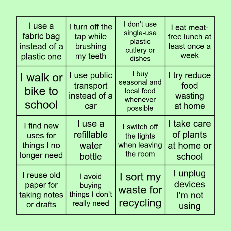 This bingo card has 16 words: I avoid buying things I don’t really need, I take care of plants at home or school, I don’t use single-use plastic cutlery or dishes, I use a fabric bag instead of a plastic one, I find new uses for things I no longer need, I turn off the tap while brushing my teeth, I switch off the lights when leaving the room, I sort my waste for recycling, I walk or bike to school, I use public transport instead of a car, I reuse old paper for taking notes or drafts, I eat meat-free lunch at least once a week, I use a refillable water bottle, I try reduce food wasting at home, I buy seasonal and local food whenever possible and I unplug devices I’m not using.