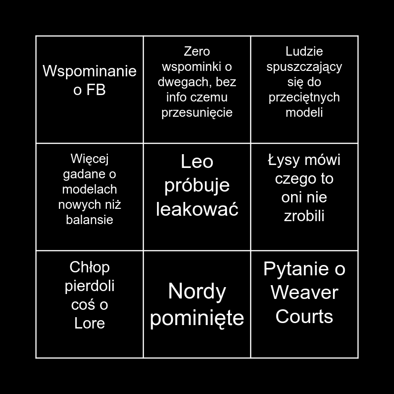 This bingo card has a free space and 8 words: Łysy mówi czego to oni nie zrobili, Ludzie spuszczający się do przeciętnych modeli, Zero wspominki o dwegach, bez info czemu przesunięcie, Chłop pierdoli coś o Lore, Wspominanie o FB, Pytanie o Weaver Courts, Więcej gadane o modelach nowych niż balansie and Nordy pominięte.