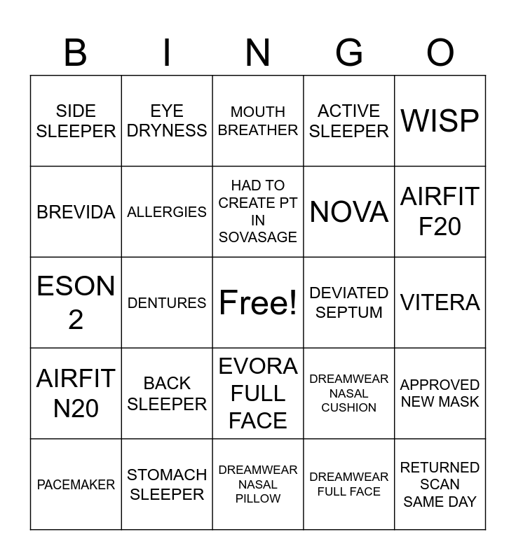 This bingo card has a free space and 29 words: PACEMAKER, AHI OVER 40, DENTURES, CLAUSTROPHOBIC, SIDE SLEEPER, MOUTH BREATHER, ALLERGIES, BACK SLEEPER, DEVIATED SEPTUM, STOMACH SLEEPER, VITERA, RETURNED SCAN SAME DAY, DREAMWEAR NASAL PILLOW, DREAMWEAR FULL FACE, AIRFIT F20, AIRFIT F30, EVORA FULL FACE, AIRFIT N20, WISP, ESON 2, DREAMWEAR NASAL CUSHION, P10, NOVA, BREVIDA, ACTIVE SLEEPER, EYE DRYNESS, APPROVED NEW MASK, HAD TO CREATE PT IN SOVASAGE and PT REPORTED WEIGHT.