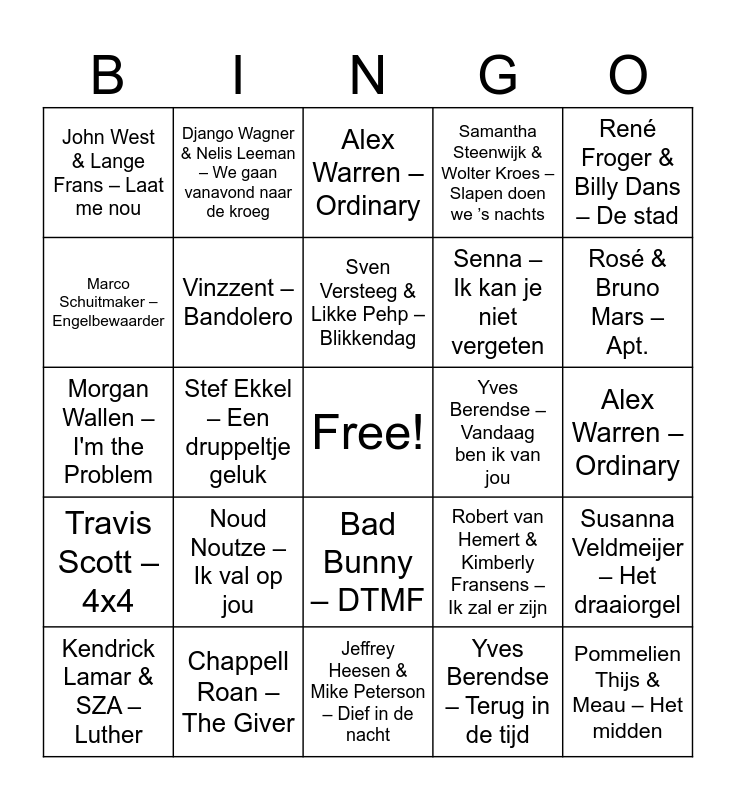 This bingo card has a free space and 49 words: Martin Morero – Spijt is voor later, Pommelien Thijs & Meau – Het midden, Yves Berendse & Emma Heesters – Alleen met jou, Jeffrey Heesen & Mike Peterson – Dief in de nacht, Noud Noutze – Ik val op jou, Suzan & Freek – Ken je dat gevoel, Django Wagner & Nelis Leeman – We gaan vanavond naar de kroeg, Marco Schuitmaker – Vergeef me, Marco Schuitmaker – Engelbewaarder, Poema’s & Snelle – Op jou heb ik gewacht, Vinzzent – Bandolero, Samantha Steenwijk & Wolter Kroes – Slapen doen we ’s nachts, Susanna Veldmeijer – Het draaiorgel, Robert van Hemert & Kimberly Fransens – Ik zal er zijn, Jannes – Verder met m’n leven, Roxy Dekker – Ga dan!, Sven Versteeg & Likke Pehp – Blikkendag, Yves Berendse – Vandaag ben ik van jou, Danilo Kuiters – Wat als ik wat mis, René Froger & Billy Dans – De stad, Stef Ekkel – Een druppeltje geluk, Yves Berendse – Terug in de tijd, John West & Lange Frans – Laat me nou, Senna – Ik kan je niet vergeten, Lady Gaga & Bruno Mars – Die with a Smile, Rosé & Bruno Mars – Apt., Kendrick Lamar & SZA – Luther, Morgan Wallen – Smile, Bad Bunny – DTMF, Travis Scott – 4x4, Chappell Roan – Pink Pony Club, Drake – Gimme a Hug, Playboi Carti – Evil J0rdan, Playboi Carti & The Weeknd – Rather Lie, Chappell Roan – The Giver, Doechii – Anxiety, Morgan Wallen – Just in Case, BigXthaPlug ft. Bailey Zimmerman – All the Way, Alex Warren – Ordinary, Anyma & Ellie Goulding – Hypnotized, Lola Young – Messy, SZA & Kendrick Lamar – 30 for 30, Chappell Roan – Good Luck, Babe!, Doechii – Anxiety, Morgan Wallen – I'm the Problem, Alex Warren – Ordinary, Chappell Roan – The Giver, Playboi Carti – Evil J0rdan and Drake – Gimme a Hug.