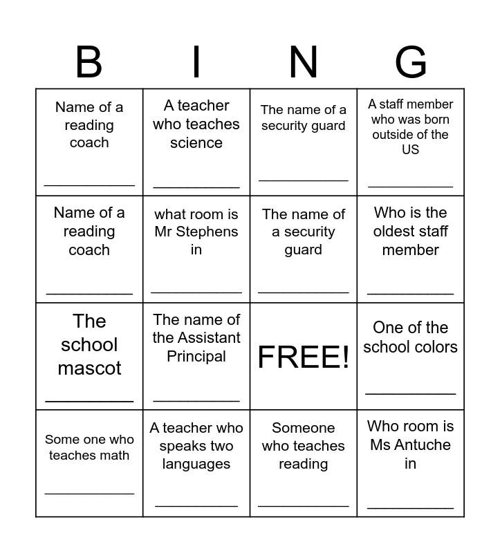 This bingo card has 16 words: A teacher who speaks two languages __________, One of the school colors __________, The name of a security guard ____________, Name of a reading coach ___________, The school mascot ________, A teacher who teaches science __________, FREE!, Someone who teaches reading ___________, Name of a reading coach __________, what room is Mr Stephens in ___________, Some one who teaches math ____________, A staff member who was born outside of the US ____________, The name of the Assistant Principal __________, Who is the oldest staff member __________, The name of a security guard ___________ and Who room is Ms Antuche in __________.