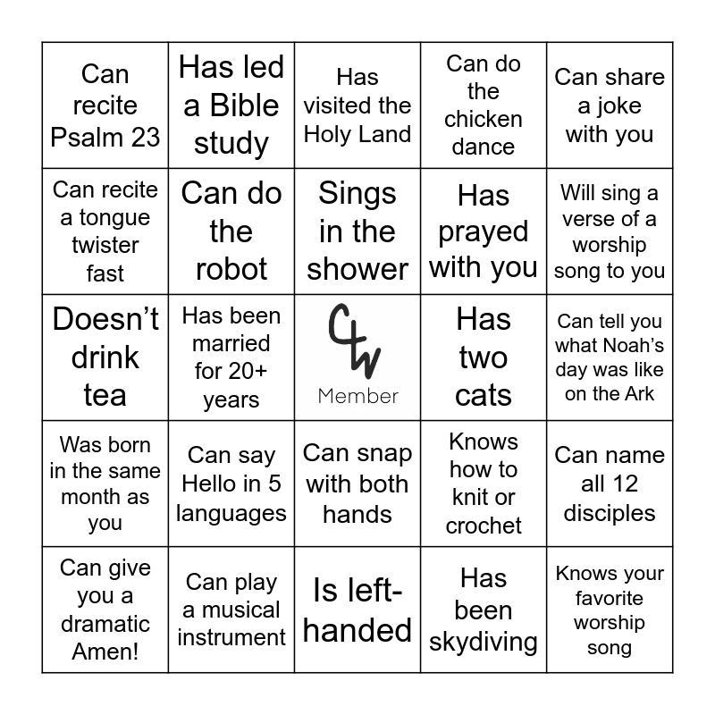 This bingo card has a free space and 63 words: Is wearing something home made, Has the same favorite color as you, Has invited someone new to church, Can name all 12 disciples, Is an only child, Will show you a dance move, Has led a Bible study, Has a tattoo, Sings in the shower, Shares a similar hobby as you, Can snap with both hands, Has lived in more than three states, Can tell you what Noah’s day was like on the Ark, Can share a joke with you, Can do an air guitar or drum solo, Can recite a tongue twister fast, Has been married for 20+ years, Can recite Psalm 23, Has a master’s degree, Has prayed with you, Can say Hello in 5 languages, Was born in the same month as you, Can do the chicken dance, Has run a marathon, Has the same shoe size as you, Can do an impression of Micah, Can speak more than two languages, Can imitate an animal, Has been on TV or in a movie, Is the youngest sibling, Has a birthday in the same month as you, Has more than three siblings, Has gone on a road trip this past year, Has traveled to more than 3 countries, Will sing a verse of a worship song to you, Can give you a dramatic Amen!, Loves your favorite pizza, Has been skydiving, Can do a British accent, Can do the robot, Doesn’t drink tea, Has two cats, Has sang or played with the CW worship team, Has never broken a bone, Knows your favorite worship song, Can play a musical instrument, Has been to a concert in the past month, Knows how to knit or crochet, Can touch their toes without bending their knees, Has met a celebrity, Can say the alphabet backwards, Is left-handed, Is the same height as you, Helps with child care during Sunday service, Can drive a stick shift, Has visited the Holy Land, Knows the fruits of the spirit, Can raise one eyebrow, Can whistle loudly, Is the oldest sibling, Is a new CW member, Can recall a sermon that changed their life and Is involved in church outreach.