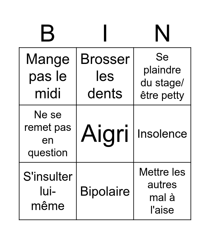 This bingo card has a free space and 8 words: Insolence, Se plaindre du stage/être petty, Brosser les dents, S'insulter lui-même, Mange pas le midi, Mettre les autres mal à l'aise, Ne se remet pas en question and Bipolaire.