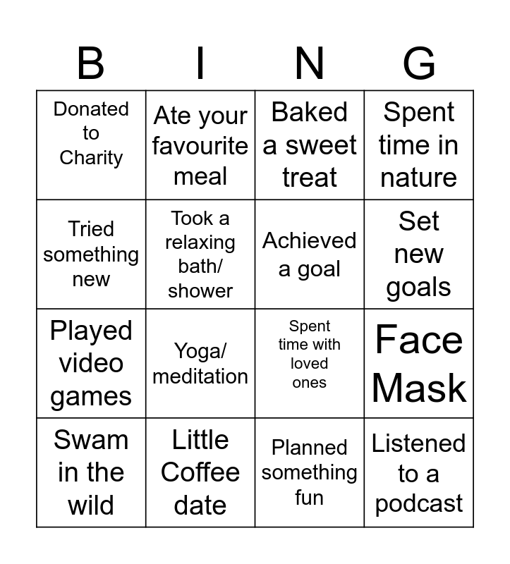 This bingo card has 20 words: Face Mask, Massage from partner/ friend/ family, Baked a sweet treat, Tried a new form of exercise, Swam in the wild, Tried something new, Little Coffee date, Donated to Charity, Played video games, Ate your favourite meal, Yoga/ meditation, Spent time with loved ones, Took a relaxing bath/ shower, Listened to a podcast, Achieved a goal, Celebrated, Set new goals, Spent time in nature, Planned something fun and Found a new good song.