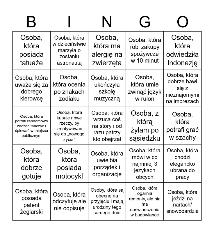 This bingo card has 25 words: Osoba, która posiada motocykl, Osoby, które są obecne na przyjęciu i mają urodziny tego samego dnia, Osoba, która ukończyła szkołę muzyczną, Osoba, która posiada patent żeglarski, Osoba, która odwiedziła Indonezję, Osoba, która posiada tatuaże, Osoba, która uważa się za dobrego kierowcę, Osoba, która w dzieciństwie marzyła o zostaniu astronautą, Osoba, z którą żyłam po sąsiedzku, Osoba, która uwielbia porządek i organizację, Osoba, która umie zwinąć język w rulon, Osoba, która potrafi randomowo zacząć tańczyć i śpiewać w miejscu publicznym, Osoba, która mówi w co najmniej 3 językach obcych, Osoba, która chodzi elegancko ubrana do pracy, Osoba, która ocenia po znakach zodiaku, Osoba, która jeździ na nartach/ snowboardzie, Osoba, która potrafi grać w szachy, Osoba, która ma alergię na zwierzęta, Osoba, która dobrze bawi się z nieznajomymi na imprezach, Osoba, która kupuje nowe rzeczy, by zmotywować się do „nowego życia”, Osoba, która wrzuca coś na story i od razu patrzy kto obejrzał, Osoba, która odczytuje ale nie odpisuje, Osoba, która dobrze gotuje, Osoba, która robi zakupy spożywcze w 10 minut and Osoba, która ogarnia remonty, ale nie ma doświadczenia w budowlance.