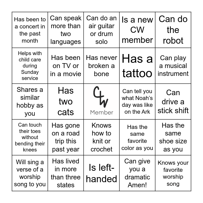 This bingo card has a free space and 63 words: Is the oldest sibling, Can do an impression of Micah, Is the youngest sibling, Has the same shoe size as you, Can say the alphabet backwards, Has been married for 20+ years, Can speak more than two languages, Knows the fruits of the spirit, Has never broken a bone, Has traveled to more than 3 countries, Knows how to knit or crochet, Was born in the same month as you, Can drive a stick shift, Can do the robot, Has run a marathon, Helps with child care during Sunday service, Has two cats, Has been to a concert in the past month, Can do a British accent, Has a tattoo, Has gone on a road trip this past year, Can touch their toes without bending their knees, Is a new CW member, Can name all 12 disciples, Has visited the Holy Land, Can whistle loudly, Can snap with both hands, Has a master’s degree, Has led a Bible study, Has been skydiving, Can recite a tongue twister fast, Can share a joke with you, Can do the chicken dance, Can raise one eyebrow, Can play a musical instrument, Will sing a verse of a worship song to you, Is involved in church outreach, Can give you a dramatic Amen!, Will show you a dance move, Has been on TV or in a movie, Shares a similar hobby as you, Can tell you what Noah’s day was like on the Ark, Can recite Psalm 23, Is the same height as you, Knows your favorite worship song, Has lived in more than three states, Can imitate an animal, Has the same favorite color as you, Is wearing something home made, Has a birthday in the same month as you, Has sang or played with the CW worship team, Is left-handed, Sings in the shower, Has prayed with you, Loves your favorite pizza, Can do an air guitar or drum solo, Can say Hello in 5 languages, Has more than three siblings, Can recall a sermon that changed their life, Has met a celebrity, Is an only child, Doesn’t drink tea and Has invited someone new to church.