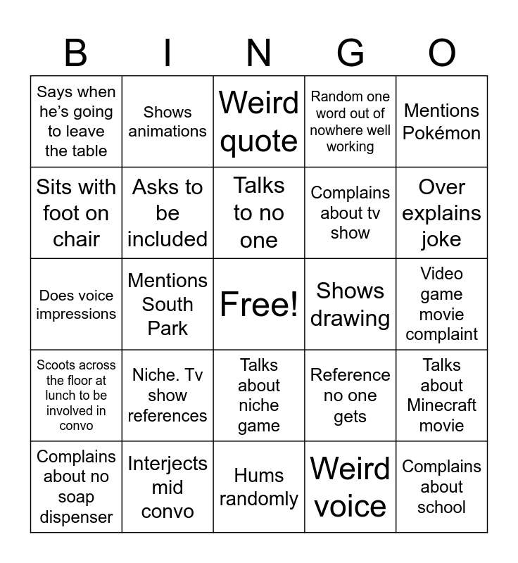 This bingo card has a free space and 24 words: Niche. Tv show references, Interjects mid convo, Talks to no one, Complains about no soap dispenser, Mentions Pokémon, Says when he’s going to leave the table, Sits with foot on chair, Shows animations, Shows drawing, Talks about niche game, Complains about tv show, Does voice impressions, Reference no one gets, Talks about Minecraft movie, Asks to be included, Weird voice, Video game movie complaint, Weird quote, Over explains joke, Mentions South Park, Complains about school, Scoots across the floor at lunch to be involved in convo, Random one word out of nowhere well working and Hums randomly.