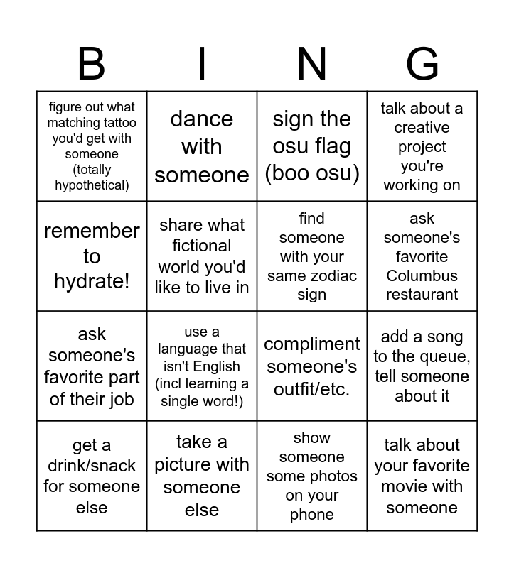 This bingo card has 20 words: add a song to the queue, tell someone about it, share a neat party trick, sign the osu flag (boo osu), take a break from socializing if you need, get a drink/snack for someone else, remember to hydrate!, take a picture with someone else, figure out what matching tattoo you'd get with someone (totally hypothetical), ask someone's favorite part of their job, dance with someone, use a language that isn't English (incl learning a single word!), compliment someone's outfit/etc., share what fictional world you'd like to live in, talk about your favorite movie with someone, find someone with your same zodiac sign, share about the most recent interesting media you consumed, ask someone's favorite Columbus restaurant, talk about a creative project you're working on, show someone some photos on your phone and offer to throw away someone's trash.
