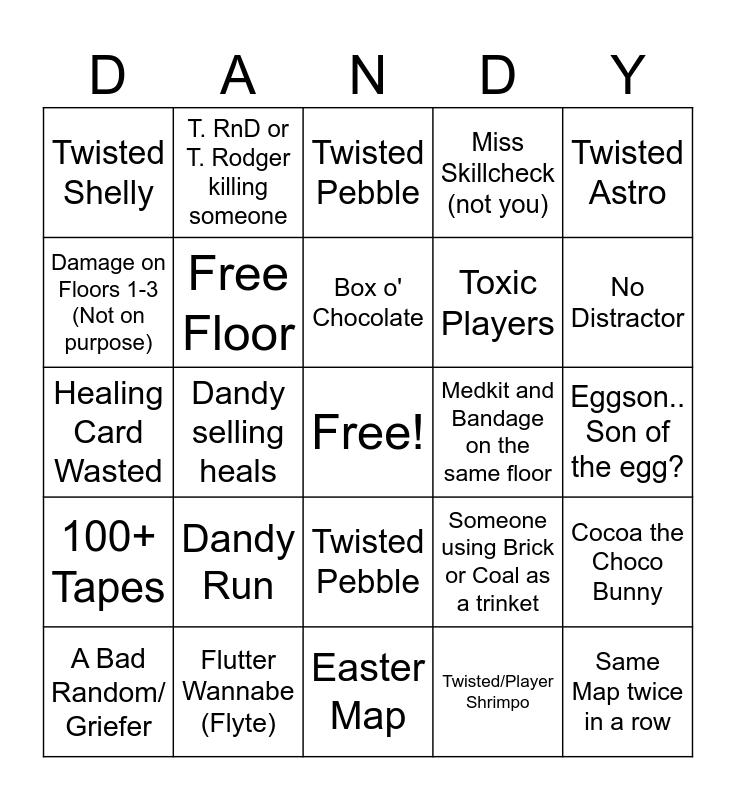 This bingo card has a free space and 29 words: A Bad Random/ Griefer, Main Twisted, Dandy selling heals, Blackout, Twisted Shelly, Twisted Pebble, Free Floor, Dandy Run, Medkit and Bandage on the same floor, Flutter Wannabe (Flyte), Eggson.. Son of the egg?, Same Map twice in a row, Easter Map, Twisted/Player Shrimpo, No Distractor, Yatta, Twisted Pebble, 100+ Tapes, Twisted Astro, Healing Card Wasted, Someone using Brick or Coal as a trinket, Fart, Toxic Players, Damage on Floors 1-3 (Not on purpose), Miss Skillcheck (not you), T. RnD or T. Rodger killing someone, Cocoa the Choco Bunny, Box o' Chocolate and Twisted Vee.