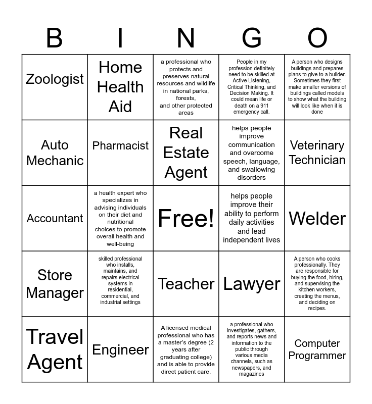 This bingo card has a free space and 24 words: skilled professional who installs, maintains, and repairs electrical systems in residential, commercial, and industrial settings, Engineer, Real Estate Agent, Travel Agent, A person who designs buildings and prepares plans to give to a builder. Sometimes they first make smaller versions of buildings called models to show what the building will look like when it is done, Zoologist, Auto Mechanic, Home Health Aid, helps people improve their ability to perform daily activities and lead independent lives, Teacher, helps people improve communication and overcome speech, language, and swallowing disorders, Accountant, Lawyer, A person who cooks professionally. They are responsible for buying the food, hiring, and supervising the kitchen workers, creating the menus, and deciding on recipes., Pharmacist, a professional who investigates, gathers, and reports news and information to the public through various media channels, such as newspapers, and magazines, Welder, a professional who protects and preserves natural resources and wildlife in national parks, forests, and other protected areas, Veterinary Technician, a health expert who specializes in advising individuals on their diet and nutritional choices to promote overall health and well-being, Computer Programmer, Store Manager, People in my profession definitely need to be skilled at Active Listening, Critical Thinking, and Decision Making. It could mean life or death on a 911 emergency call. and A licensed medical professional who has a master’s degree (2 years after graduating college) and is able to provide direct patient care..