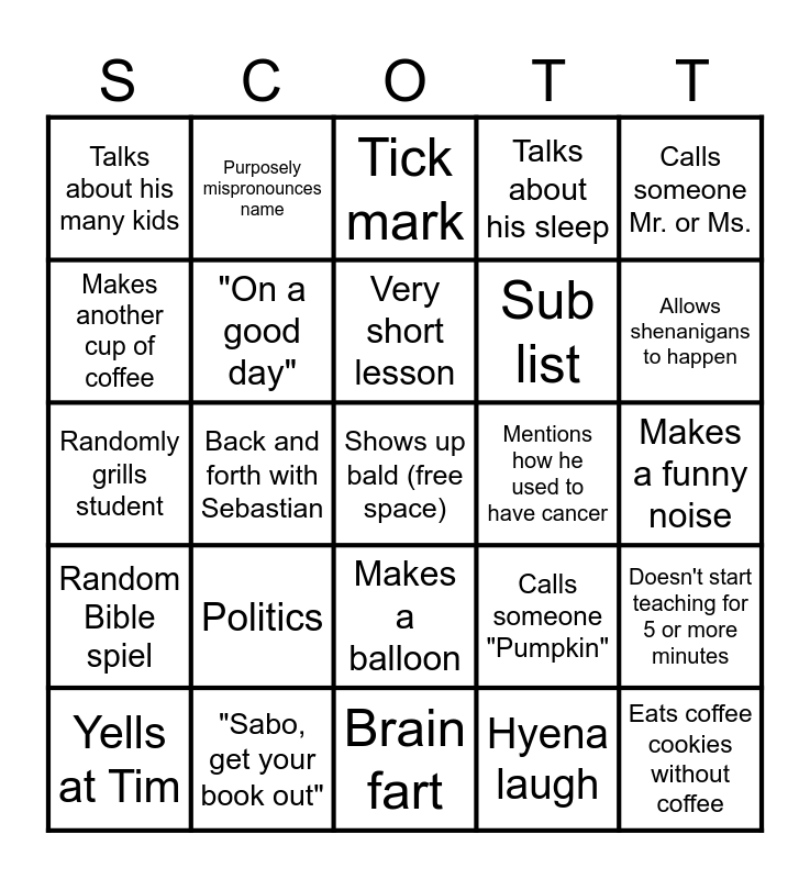 This bingo card has a free space and 29 words: Yells at Tim, Yells at Zorkot, Back and forth with Sebastian, Says something completely out of pocket, Talks about his many kids, Tick mark, "On a good day", Politics, Mentions how he used to have cancer, "Sabo, get your book out", Makes a funny noise, Eats coffee cookies without coffee, Brain fart, Hyena laugh, Allows shenanigans to happen, Uncomfortable silence waiting for answer, Makes a balloon, Random Bible spiel, Calls someone Mr. or Ms., Randomly grills student, Calls someone "Pumpkin", "You are absolutely correct", Sub list, Makes another cup of coffee, Talks about his sleep, Purposely mispronounces name, Doesn't start teaching for 5 or more minutes, Very short lesson and Big packet.