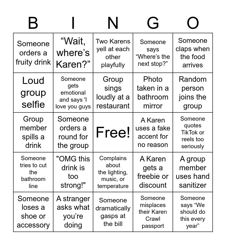 This bingo card has a free space and 24 words: "OMG this drink is too strong!", A stranger asks what you’re doing, Group sings loudly at a restaurant, Someone loses a shoe or accessory, Someone claps when the food arrives, Someone orders a fruity drink, Loud group selfie, “Wait, where’s Karen?”, A Karen uses a fake accent for no reason, Complains about the lighting, music, or temperature, Photo taken in a bathroom mirror, Group member spills a drink, A Karen gets a freebie or discount, A group member uses hand sanitizer, Someone gets emotional and says 'I love you guys, Someone misplaces their Karen Crawl passport, Someone quotes TikTok or reels too seriously, Two Karens yell at each other playfully, Random person joins the group, Someone orders a round for the group, Someone says “We should do this every year”, Someone tries to cut the bathroom line, Someone says “Where’s the next stop?” and Someone dramatically gasps at the bill.