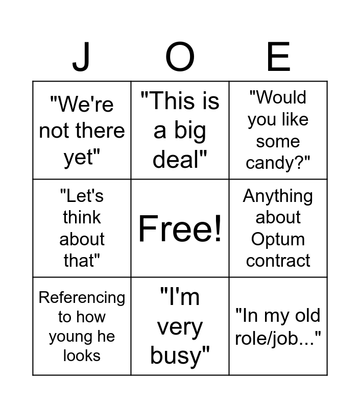 This bingo card has a free space and 10 words: "I'm very busy", "Would you like some candy?", "We're not there yet", "In my old role/job...", "Let's think about that", Referencing to how young he looks, "This is a big deal", "I knocked it out of the park", Anything about Optum contract and "IDK if you know this, but I'm a big deal".