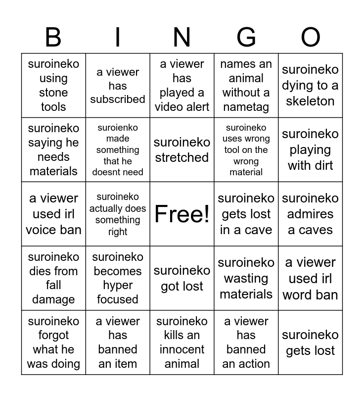 This bingo card has a free space and 39 words: suroineko died, suroineko kills a mob, suroineko has a skill issue, suroienko made something that he doesnt need, suroineko forgot what he was doing, suroineko got lost, suroineko stretched, suroineko dying to a zombie, suroineko dying to a skeleton, suroineko dies from fall damage, suroineko actually does something right, names an animal without a nametag, suroineko gets lost, suroineko admires a caves, suroineko gets lost in a cave, suroineko becomes hyper focused, suroineko gets side tracked, suroineko using stone tools, suroineko is alive for longer than 5 days, suroineko wasting materials, suroineko saying he needs materials, suroineko kills an innocent animal, suroineko uses wrong tool on the wrong material, suroineko playing with dirt, suroineko gets called a dictator/supreme leader from longster, Frozenamaranth is disapointed suroineko, vectra bullies suroineko, a new follower has joined the stream, a viwer has joined the discord, a viewer has subscribed, a viewer has cheered bits, a viewer has played a sound alert, a viewer has played a video alert, a viewer has banned an item, a viewer has banned an action, chatbot sent an automatic message, a viewer used irl word ban, a viewer used irl voice ban and a viewer has redeemed more than 5000 points.