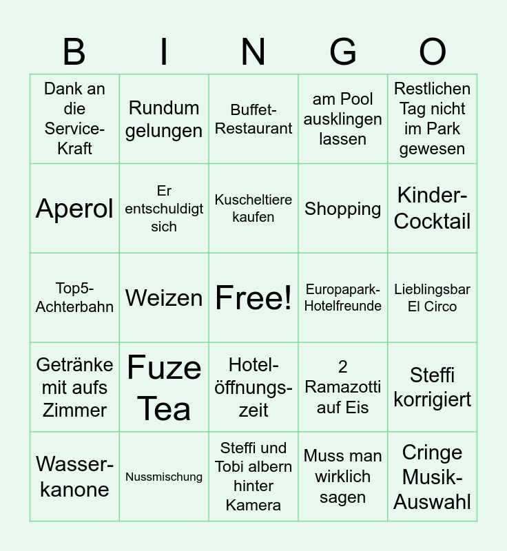 This bingo card has a free space and 24 words: Fuze Tea, Nussmischung, Kuscheltiere kaufen, Wasser-kanone, Restlichen Tag nicht im Park gewesen, Dank an die Service-Kraft, Aperol, Rundum gelungen, Europapark-Hotelfreunde, Hotel-öffnungs-zeit, Shopping, Top5-Achterbahn, 2 Ramazotti auf Eis, Steffi korrigiert, Er entschuldigt sich, Muss man wirklich sagen, Lieblingsbar El Circo, Buffet-Restaurant, Kinder-Cocktail, Weizen, Cringe Musik-Auswahl, Getränke mit aufs Zimmer, am Pool ausklingen lassen and Steffi und Tobi albern hinter Kamera.