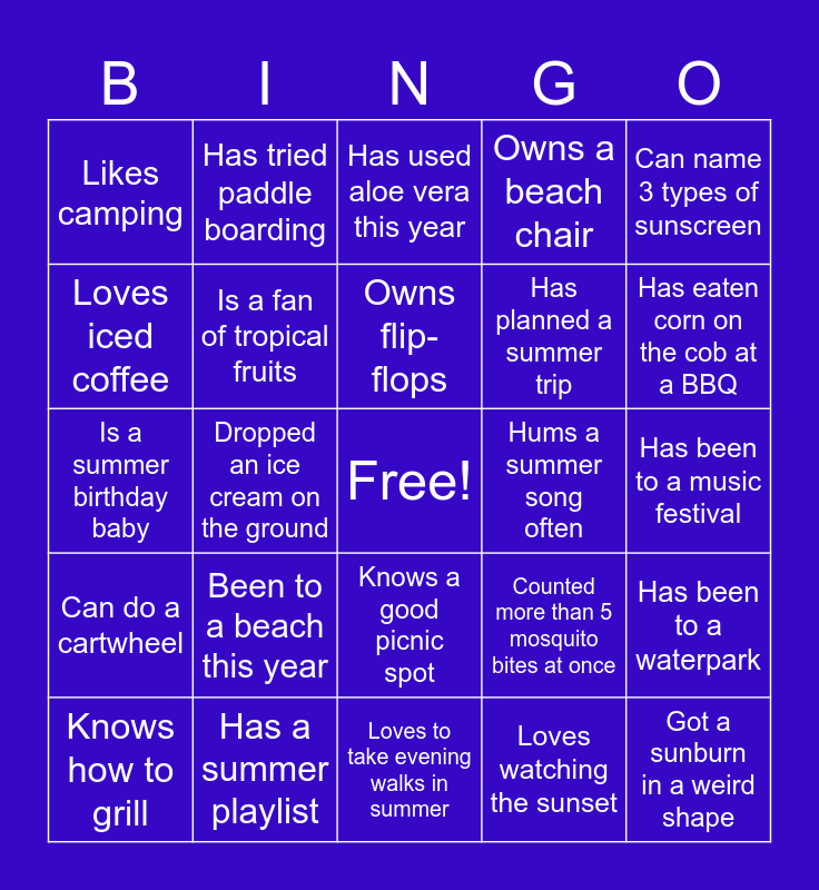 This bingo card has a free space and 24 words: Been to a beach this year, Has a summer playlist, Owns flip-flops, Knows how to grill, Can name 3 types of sunscreen, Likes camping, Loves iced coffee, Has tried paddle boarding, Hums a summer song often, Knows a good picnic spot, Has planned a summer trip, Is a summer birthday baby, Counted more than 5 mosquito bites at once, Has been to a waterpark, Is a fan of tropical fruits, Loves watching the sunset, Has been to a music festival, Has used aloe vera this year, Has eaten corn on the cob at a BBQ, Dropped an ice cream on the ground, Got a sunburn in a weird shape, Can do a cartwheel, Owns a beach chair and Loves to take evening walks in summer.