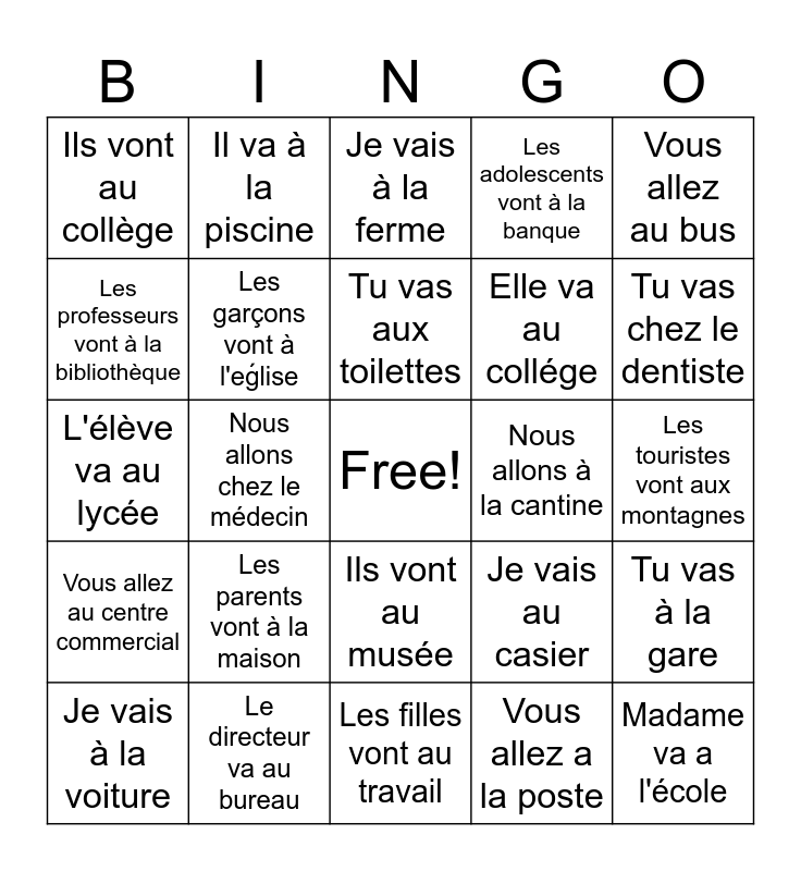 This bingo card has a free space and 24 words: Les parents vont à la maison, Le directeur va au bureau, Tu vas aux toilettes, Je vais à la voiture, Vous allez au bus, Ils vont au collège, Les professeurs vont à la bibliothèque, Il va à la piscine, Nous allons à la cantine, Ils vont au musée, Elle va au collége, L'élève va au lycée, Je vais au casier, Tu vas à la gare, Les garçons vont à l'eǵlise, Vous allez a la poste, Les touristes vont aux montagnes, Je vais à la ferme, Tu vas chez le dentiste, Nous allons chez le médecin, Madame va a l'école, Vous allez au centre commercial, Les adolescents vont à la banque and Les filles vont au travail.