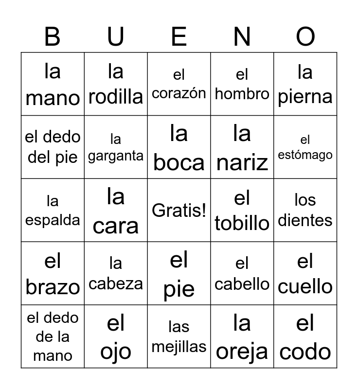 This bingo card has a free space and 24 words: la cabeza, el ojo, la boca, el dedo de la mano, la pierna, la mano, el dedo del pie, la rodilla, el tobillo, el pie, la nariz, la espalda, el cabello, el cuello, la garganta, la oreja, los dientes, el corazón, el estómago, la cara, el codo, el brazo, el hombro and las mejillas.