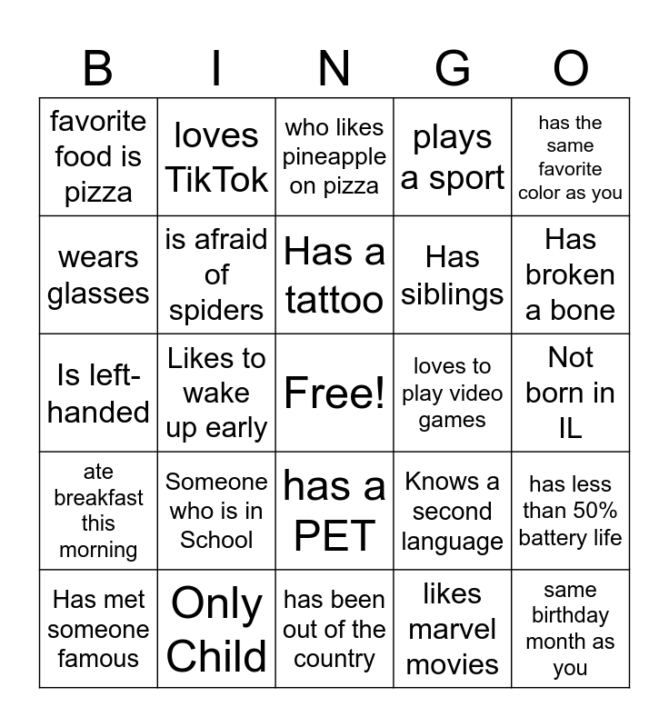 This bingo card has a free space and 24 words: Someone who is in School, Only Child, Has a tattoo, Has met someone famous, has the same favorite color as you, favorite food is pizza, wears glasses, loves TikTok, loves to play video games, has a PET, Has siblings, Is left-handed, Knows a second language, has less than 50% battery life, is afraid of spiders, likes marvel movies, Not born in IL, who likes pineapple on pizza, Has broken a bone, Likes to wake up early, same birthday month as you, ate breakfast this morning, plays a sport and has been out of the country.