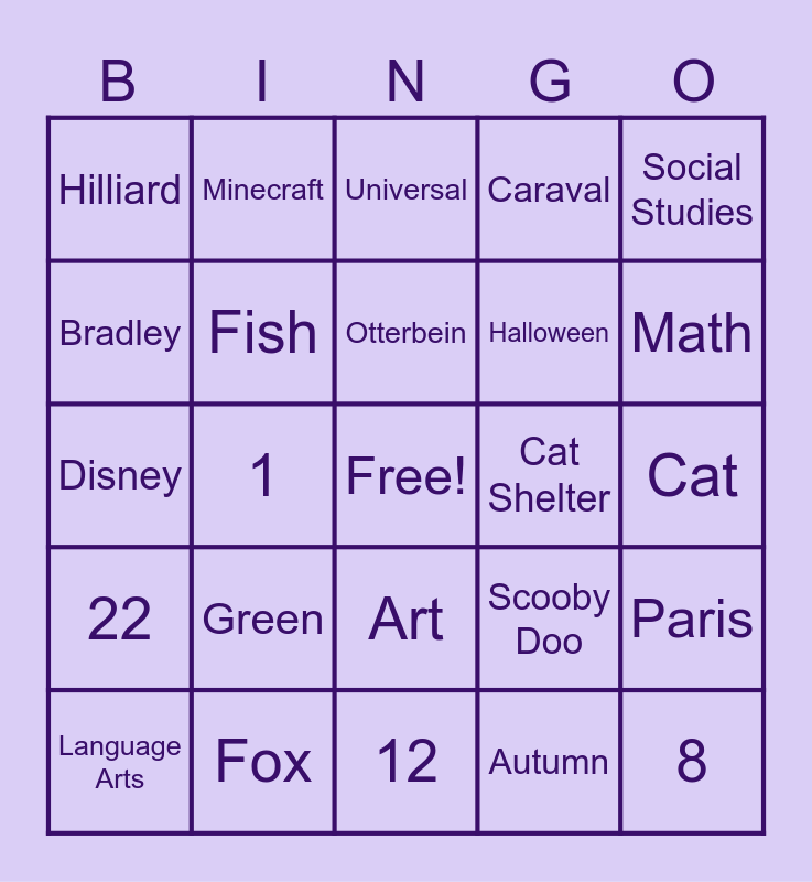 This bingo card has a free space and 24 words: Green, Fox, Otterbein, Language Arts, Social Studies, Hilliard, Bradley, Minecraft, Cat Shelter, Art, Halloween, Disney, Scooby Doo, Paris, Fish, Autumn, Cat, Universal, Math, 1, 8, 22, Caraval and 12.