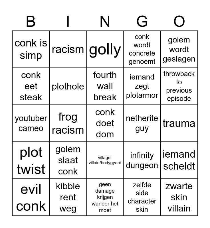 This bingo card has a free space and 24 words: golem slaat conk, kibble rent weg, fourth wall break, evil conk, golem wordt geslagen, conk is simp, conk eet steak, racism, netherite guy, villager villain/bodygyard, iemand zegt plotarmor, youtuber cameo, infinity dungeon, iemand scheldt, plothole, zelfde side character skin, trauma, golly, throwback to previous episode, frog racism, zwarte skin villain, plot twist, conk wordt concrete genoemt and geen damage krijgen waneer het moet.