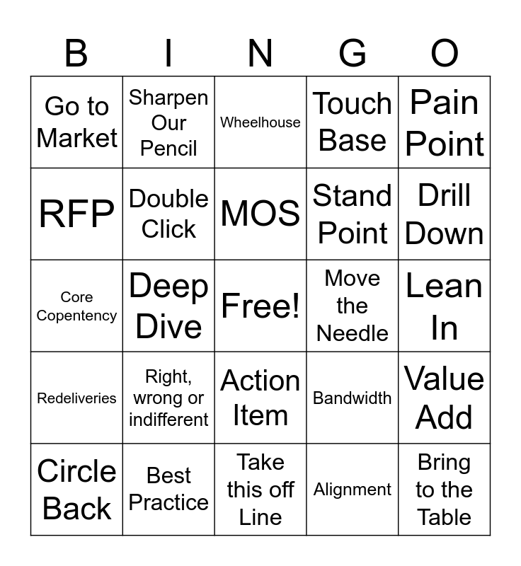 This bingo card has a free space and 24 words: Right, wrong or indifferent, Best Practice, MOS, Circle Back, Pain Point, Go to Market, RFP, Sharpen Our Pencil, Move the Needle, Action Item, Stand Point, Core Copentency, Bandwidth, Value Add, Double Click, Alignment, Lean In, Wheelhouse, Drill Down, Deep Dive, Bring to the Table, Redeliveries, Touch Base and Take this off Line.