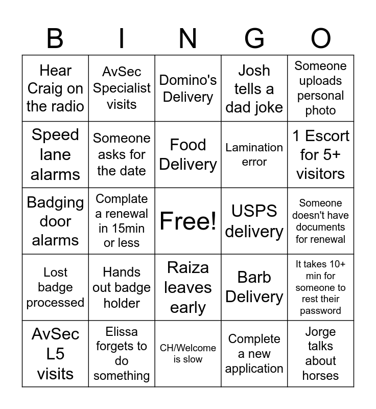 This bingo card has a free space and 26 words: Raiza leaves early, Complete a new application, Food Delivery, Elissa forgets to do something, Someone uploads personal photo, Hear Craig on the radio, Speed lane alarms, AvSec Specialist visits, Someone doesn't have documents for renewal, Barb Delivery, Lamination error, Badging door alarms, It takes 10+ min for someone to rest their password, AvSec L5 visits, Complate a renewal in 15min or less, 2 appointments show up in a row, Josh tells a dad joke, Lost badge processed, Domino's Delivery, Jorge talks about horses, 1 Escort for 5+ visitors, CH/Welcome is slow, USPS delivery, Hands out badge holder, Someone asks for the date and Shayra goes to lunch late.