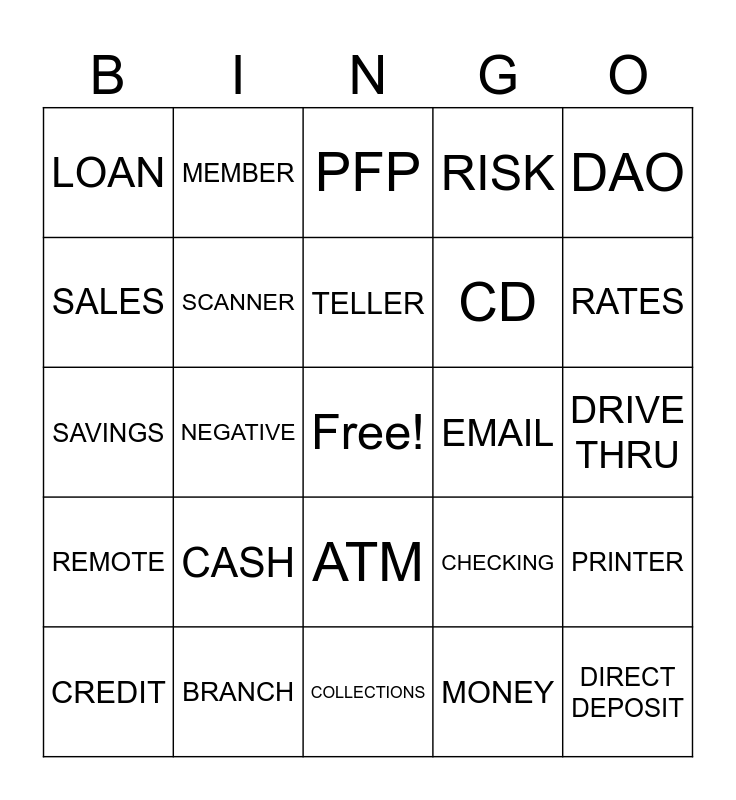 This bingo card has a free space and 24 words: CASH, BRANCH, TELLER, CREDIT, DAO, LOAN, SALES, MEMBER, EMAIL, ATM, CD, SAVINGS, CHECKING, PRINTER, SCANNER, MONEY, DRIVE THRU, PFP, RATES, NEGATIVE, DIRECT DEPOSIT, REMOTE, RISK and COLLECTIONS.