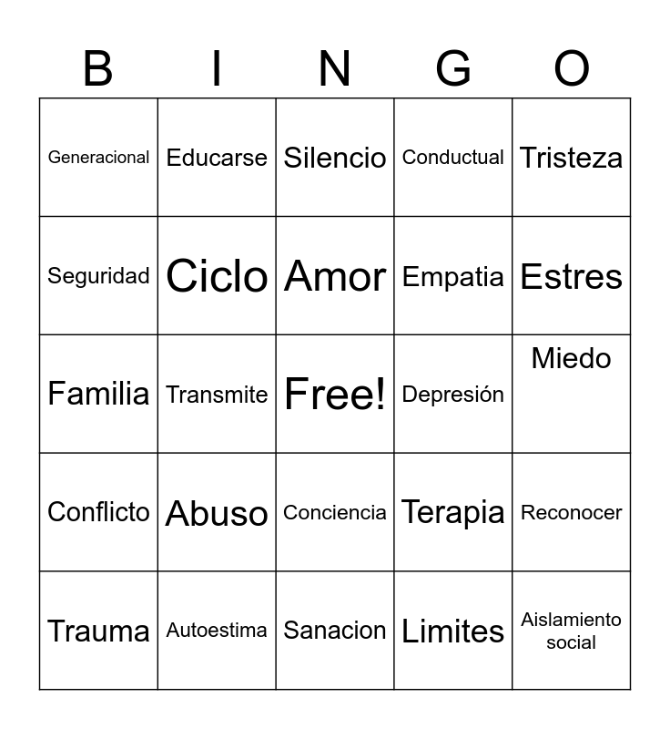 This bingo card has a free space and 29 words: Trauma, Emociones, Transmite, Ansiedad, Generacional, Silencio, Ciclo, Abuso, Depresión, Autoestima, Miedo, Aislamiento social, Sanacion, Limites, Estres, Abandono, Conciencia, Conflicto, Tristeza, Familia, Terapia, Heridas, Empatia, Seguridad, Conductual, Educarse, Reconocer, Amor and Estres postraumatico.