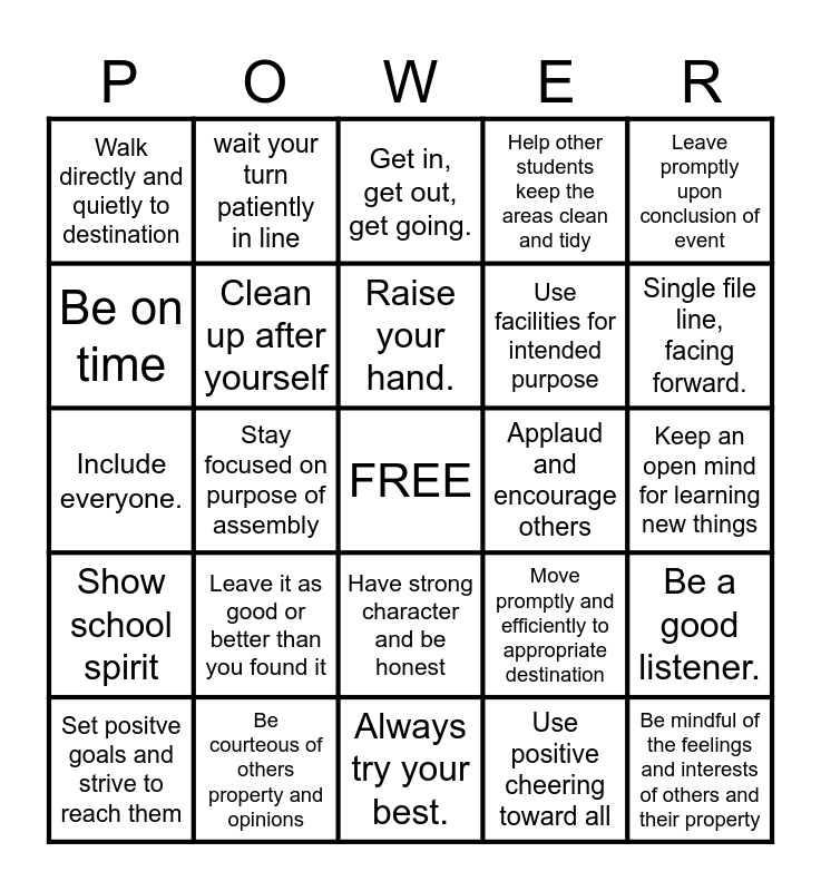 This bingo card has a free space and 28 words: Be a good listener., Go directly to class, Use facilities for intended purpose, Use positive cheering toward all, Be on time, Get in, get out, get going., wait your turn patiently in line, Show school spirit, Applaud and encourage others, Set positve goals and strive to reach them, Include everyone., Help other students keep the areas clean and tidy, Be courteous of others property and opinions, Always try your best., Single file line, facing forward., Cite any resources you use, Leave it as good or better than you found it, Clean up after yourself, Raise your hand., Have strong character and be honest, Walk directly and quietly to destination, Applaud for good plays, Be mindful of the feelings and interests of others and their property, Stay focused on purpose of assembly, Keep an open mind for learning new things, Move promptly and efficiently to appropriate destination, Leave promptly upon conclusion of event and Turn in unattended items to a staff member.