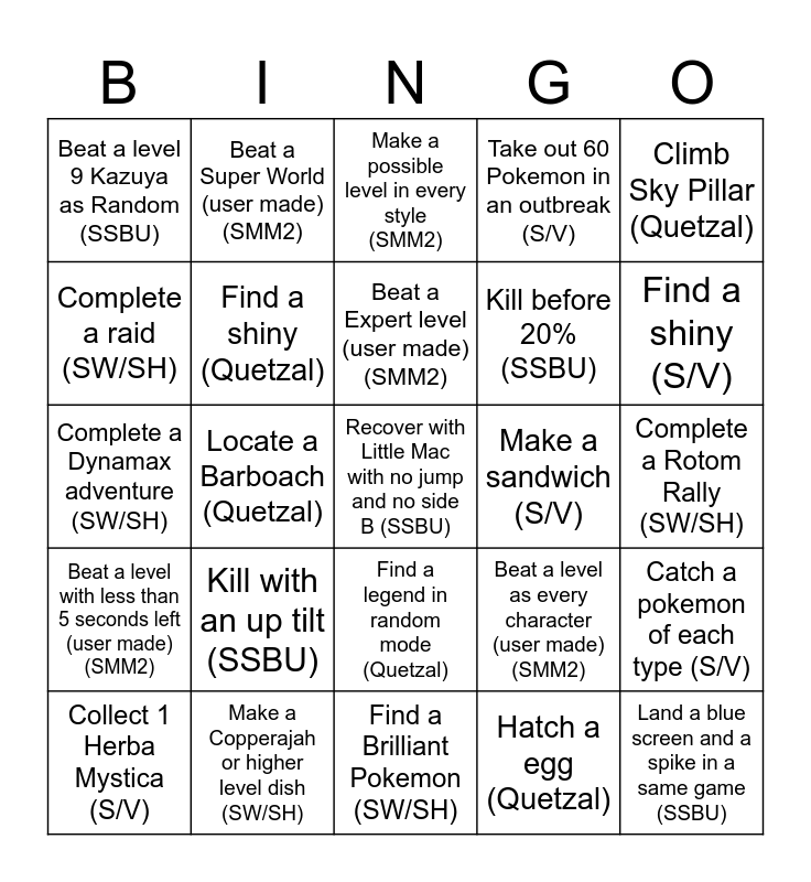 This bingo card has 25 words: Kill with an up tilt (SSBU), Find a Brilliant Pokemon (SW/SH), Beat a Expert level (user made) (SMM2), Collect 1 Herba Mystica (S/V), Climb Sky Pillar (Quetzal), Beat a level 9 Kazuya as Random (SSBU), Complete a raid (SW/SH), Beat a Super World (user made) (SMM2), Make a sandwich (S/V), Find a legend in random mode (Quetzal), Kill before 20% (SSBU), Complete a Dynamax adventure (SW/SH), Beat a level as every character (user made) (SMM2), Catch a pokemon of each type (S/V), Find a shiny (Quetzal), Land a blue screen and a spike in a same game (SSBU), Complete a Rotom Rally (SW/SH), Make a possible level in every style (SMM2), Find a shiny (S/V), Locate a Barboach (Quetzal), Recover with Little Mac with no jump and no side B (SSBU), Make a Copperajah or higher level dish (SW/SH), Beat a level with less than 5 seconds left (user made) (SMM2), Take out 60 Pokemon in an outbreak (S/V) and Hatch a egg (Quetzal).