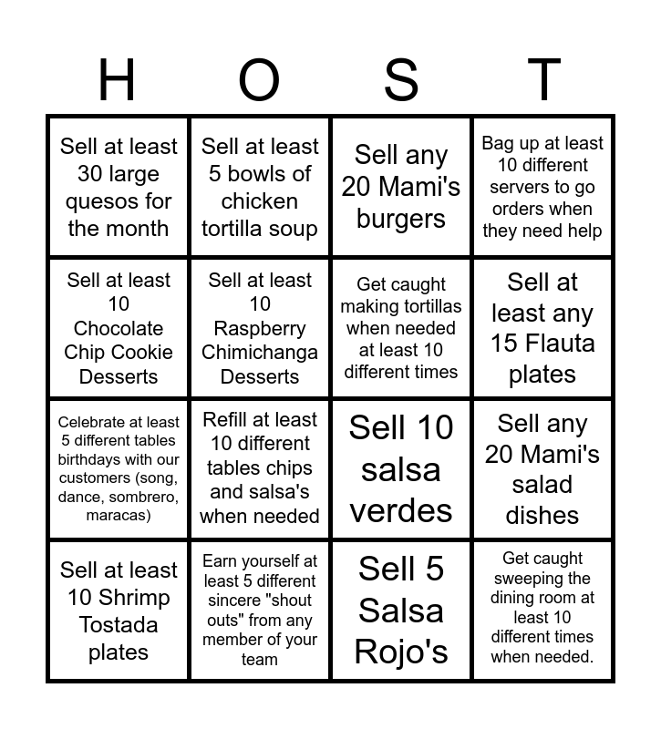 This bingo card has 16 words: Earn yourself at least 5 different sincere "shout outs" from any member of your team, Sell any 20 Mami's salad dishes, Sell any 20 Mami's burgers, Sell at least 30 large quesos for the month, Celebrate at least 5 different tables birthdays with our customers (song, dance, sombrero, maracas), Sell at least 5 bowls of chicken tortilla soup, Sell 10 salsa verdes, Sell 5 Salsa Rojo's, Sell at least 10 Chocolate Chip Cookie Desserts, Sell at least 10 Raspberry Chimichanga Desserts, Sell at least 10 Shrimp Tostada plates, Bag up at least 10 different servers to go orders when they need help, Refill at least 10 different tables chips and salsa's when needed, Sell at least any 15 Flauta plates, Get caught making tortillas when needed at least 10 different times and Get caught sweeping the dining room at least 10 different times when needed..