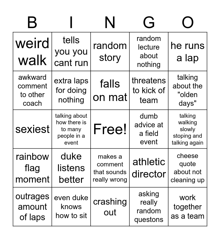 This bingo card has a free space and 24 words: duke listens better, even duke knows how to sit, falls on mat, outrages amount of laps, he runs a lap, weird walk, awkward comment to other coach, tells you you cant run, dumb advice at a field event, makes a comment that sounds really wrong, threatens to kick of team, sexiest, athletic director, cheese quote about not cleaning up, extra laps for doing nothing, asking really random questons, talking walking slowly stoping and talking again, random story, talking about the "olden days", talking about how there is to many people in a event, work together as a team, rainbow flag moment, random lecture about nothing and crashing out.