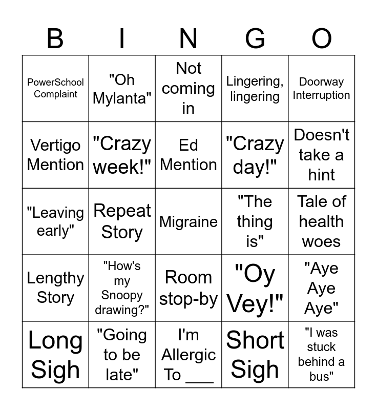 This bingo card has 25 words: Lengthy Story, "Going to be late", Migraine, Short Sigh, Doorway Interruption, PowerSchool Complaint, "Oh Mylanta", Not coming in, "The thing is", "Aye Aye Aye", Vertigo Mention, "Crazy week!", I'm Allergic To ___, "Oy Vey!", Doesn't take a hint, Long Sigh, Repeat Story, Ed Mention, "Crazy day!", Tale of health woes, "Leaving early", "How's my Snoopy drawing?", Room stop-by, Lingering, lingering and "I was stuck behind a bus".