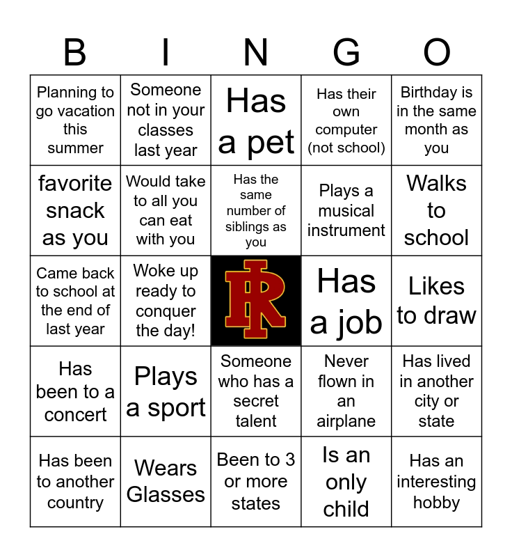 This bingo card has a free space and 24 words: Plays a sport, Wears Glasses, Has the same number of siblings as you, Has been to another country, Birthday is in the same month as you, Planning to go vacation this summer, favorite snack as you, Someone not in your classes last year, Has a job, Someone who has a secret talent, Plays a musical instrument, Came back to school at the end of last year, Never flown in an airplane, Has lived in another city or state, Would take to all you can eat with you, Is an only child, Likes to draw, Has a pet, Walks to school, Woke up ready to conquer the day!, Has an interesting hobby, Has been to a concert, Has their own computer (not school) and Been to 3 or more states.