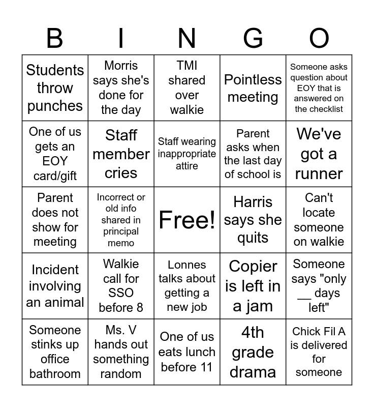 This bingo card has a free space and 24 words: Walkie call for SSO before 8, Ms. V hands out something random, Staff wearing inappropriate attire, Someone stinks up office bathroom, Someone asks question about EOY that is answered on the checklist, Students throw punches, One of us gets an EOY card/gift, Morris says she's done for the day, Harris says she quits, Lonnes talks about getting a new job, Parent asks when the last day of school is, Parent does not show for meeting, Copier is left in a jam, Someone says "only __ days left", Staff member cries, 4th grade drama, Can't locate someone on walkie, TMI shared over walkie, We've got a runner, Incorrect or old info shared in principal memo, Chick Fil A is delivered for someone, Incident involving an animal, Pointless meeting and One of us eats lunch before 11.