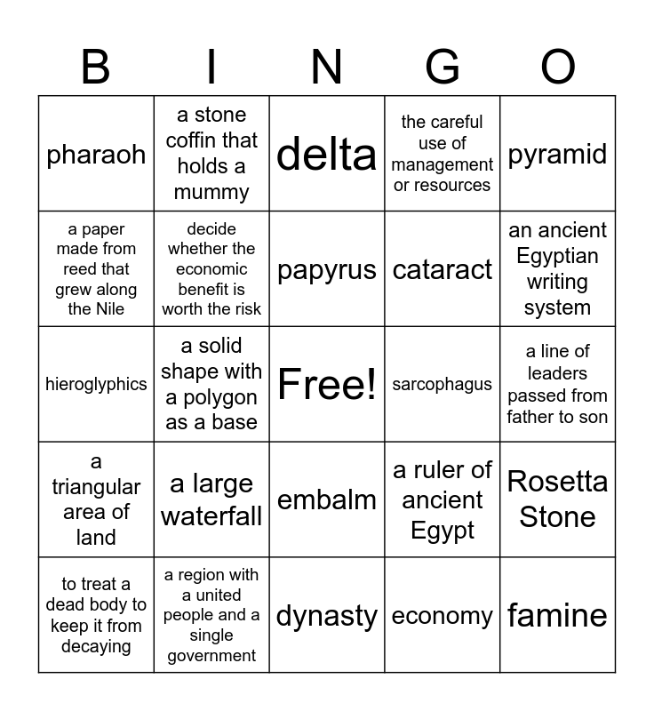 This bingo card has a free space and 24 words: a large waterfall, a region with a united people and a single government, papyrus, to treat a dead body to keep it from decaying, pyramid, pharaoh, a paper made from reed that grew along the Nile, a stone coffin that holds a mummy, sarcophagus, embalm, cataract, hieroglyphics, a ruler of ancient Egypt, Rosetta Stone, decide whether the economic benefit is worth the risk, economy, a line of leaders passed from father to son, delta, an ancient Egyptian writing system, a solid shape with a polygon as a base, famine, a triangular area of land, the careful use of management or resources and dynasty.