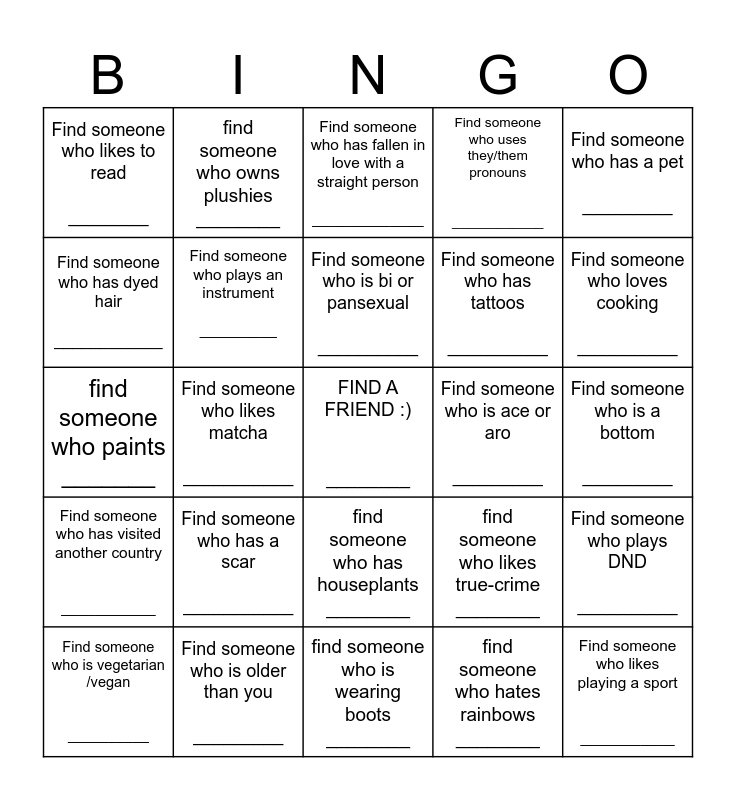 This bingo card has a free space and 38 words: Find someone who likes camping __________, Find someone who likes drawing __________, Find someone who has a younger sibling __________, Find someone who plays an instrument _________, Find someone who plays DND __________, Find someone who has a scar ___________, Find someone who is bi or pansexual __________, Find someone who likes horror movies __________, Find someone who has a pet _________, Find someone who has tattoos __________, Find someone who likes matcha ___________, Find someone who uses they/them pronouns ____________, Find someone who likes playing a sport ___________, Find someone who is a bottom _________, Find someone who has dyed hair ____________, Find someone who has visited another country ___________, Find someone whose birthday is in September __________, Find someone who has fallen in love with a straight person _____________, Find someone who can speak another language ___________, Find someone who is ace or aro _________, Find someone who likes to read ________, Find someone who is older than you _________, Find someone who loves cooking __________, Find someone who is vegetarian /vegan __________, find someone who is a top ________, find someone who is wearing boots ________, find someone who likes rock music ________, find someone left- handed ________, find someone who has uhauled before ________, find someone who reads fanfic ________, find someone listens to mitski ________, find someone who has houseplants ________, find someone who hates rainbows ________, find someone who owns plushies ________, find someone who is a switch ________, find someone who likes true-crime ________, find someone who paints _______ and find someone who runs a meme account ________.
