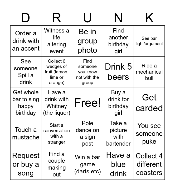 This bingo card has a free space and 27 words: Take a picture with bartender, Visit 6 bars, Drink 5 beers, Win a bar game (darts etc), See someone Spill a drink, Be in group photo, Witness a life altering event, Touch a mustache, Buy a drink for birthday girl, You see someone puke, Get whole bar to sing happy birthday, Find another birthday girl, Request or buy a song, Find a couple making out, Ride a mechanical bull, Take a shot with no hands, Collect 6 wedges of fruit (lemon, lime or orange), Find someone you know not with the group, Start a conversation with a stranger, Order a drink with an accent, Get carded, Have a blue drink, Have a drink with Whitney (the liquor), Collect 4 different coasters, Pole dance on a sign post, See bar fight/argument and See someone sleeping/passed out.