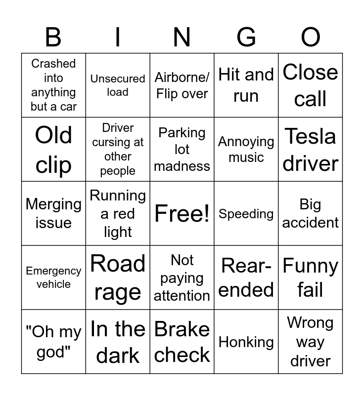 This bingo card has a free space and 24 words: Road rage, In the dark, Parking lot madness, "Oh my god", Close call, Crashed into anything but a car, Old clip, Unsecured load, Speeding, Not paying attention, Annoying music, Merging issue, Rear-ended, Funny fail, Driver cursing at other people, Honking, Big accident, Airborne/ Flip over, Tesla driver, Running a red light, Wrong way driver, Emergency vehicle, Hit and run and Brake check.