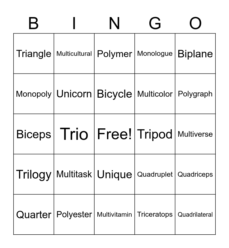 This bingo card has a free space and 35 words: Unicycle, Uniform, Unison, Unicorn, Unique, Monologue, Monopoly, Monorail, Bicycle, Bilingual, Biceps, Biplane, Biannual, Tricycle, Triangle, Tripod, Triceratops, Trio, Trilogy, Quadrilateral, Quadruplet, Quarter, Quadriceps, Polyester, Polymer, Polygraph, Polygon, Polytheism, Multicolor, Multiverse, Multiplayer, Multivitamin, Multitask, Multicultural and Multiplication.