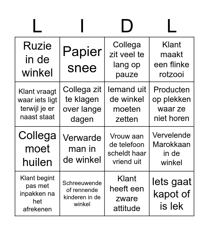 This bingo card has 16 words: Schreeuwende of rennende kinderen in de winkel, Vervelende Marokkaan in de winkel, Collega zit veel te lang op pauze, Ruzie in de winkel, Collega moet huilen, Papier snee, Vrouw aan de telefoon scheldt haar vriend uit, Klant heeft een zware attitude, Klant vraagt waar iets ligt terwijl je er naast staat, Collega zit te klagen over lange dagen, Klant begint pas met inpakken na het afrekenen, Klant maakt een flinke rotzooi, Verwarde man in de winkel, Producten op plekken waar ze niet horen, Iemand uit de winkel moeten zetten and Iets gaat kapot of is lek.