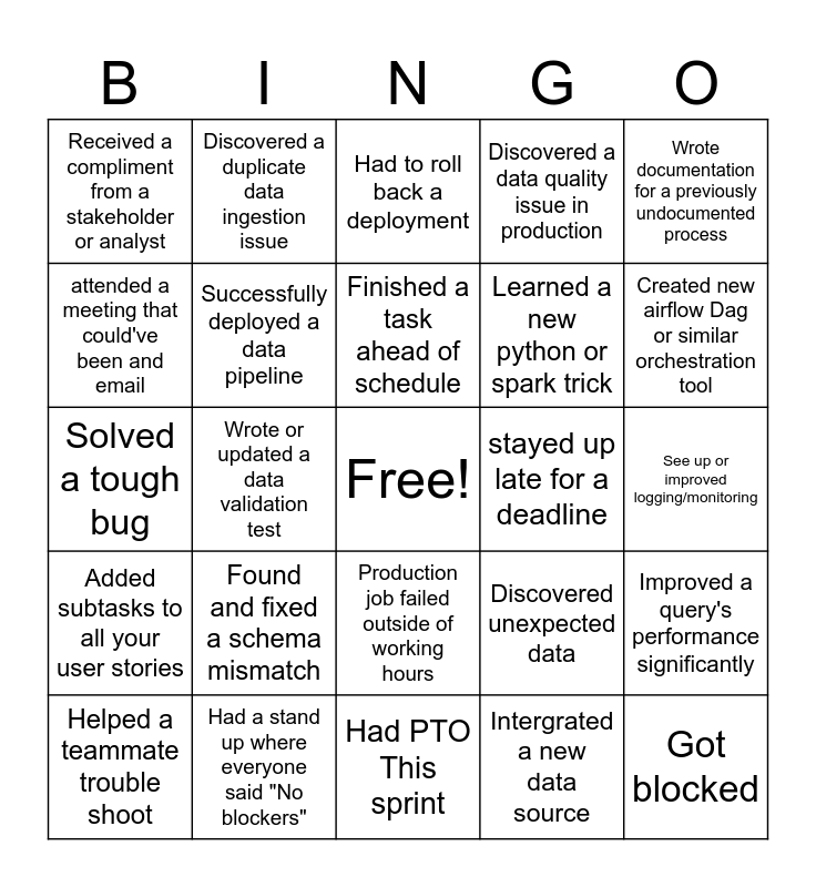 This bingo card has a free space and 24 words: Found and fixed a schema mismatch, Had a stand up where everyone said "No blockers", Finished a task ahead of schedule, Helped a teammate trouble shoot, Wrote documentation for a previously undocumented process, Received a compliment from a stakeholder or analyst, attended a meeting that could've been and email, Discovered a duplicate data ingestion issue, stayed up late for a deadline, Production job failed outside of working hours, Learned a new python or spark trick, Solved a tough bug, Discovered unexpected data, Improved a query's performance significantly, Successfully deployed a data pipeline, Intergrated a new data source, See up or improved logging/monitoring, Had to roll back a deployment, Created new airflow Dag or similar orchestration tool, Wrote or updated a data validation test, Got blocked, Added subtasks to all your user stories, Discovered a data quality issue in production and Had PTO This sprint.