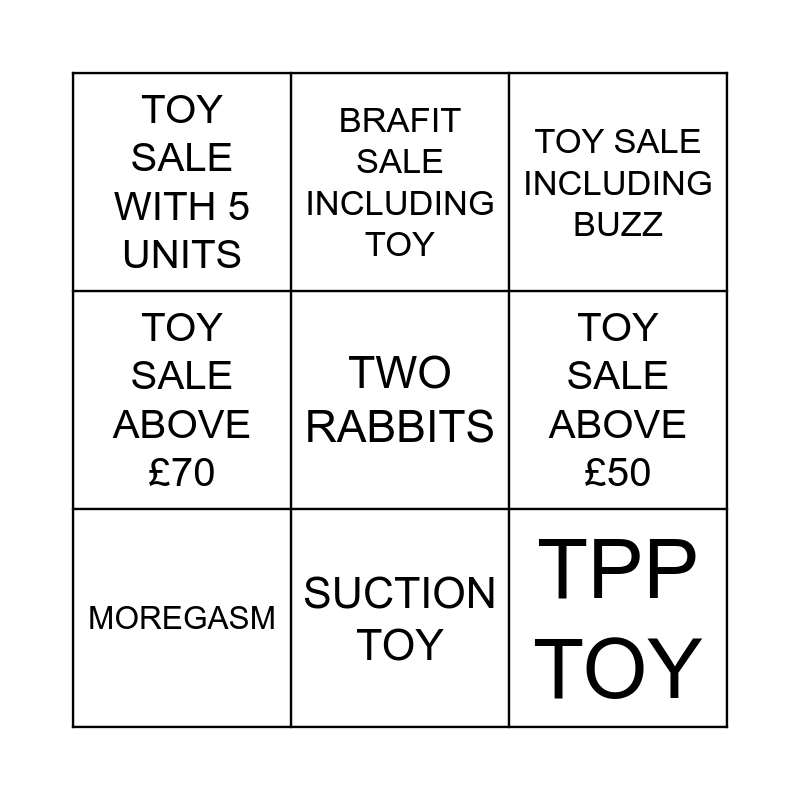 This bingo card has a free space and 8 words: TOY SALE ABOVE £50, TOY SALE INCLUDING BUZZ, BRAFIT SALE INCLUDING TOY, MOREGASM, TOY SALE WITH 5 UNITS, TPP TOY, TOY SALE ABOVE £70 and SUCTION TOY.