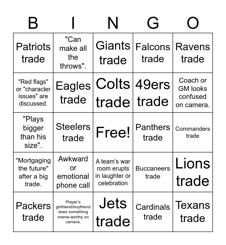 This bingo card has a free space and 55 words: Bears trade, Packers trade, Cowboys trade, Patriots trade, Jets trade, Dolphins trade, Eagles trade, Chiefs trade, 49ers trade, Vikings trade, Falcons trade, Rams trade, Chargers trade, Bills trade, Browns trade, Saints trade, Ravens trade, Steelers trade, Seahawks trade, Texans trade, Panthers trade, Jaguars trade, Buccaneers trade, Giants trade, Titans trade, Colts trade, Cardinals trade, Raiders trade, Commanders trade, Lions trade, Bengals trade, "Best available player" is mentioned., "High ceiling" or "upside" is used., "Position of need" is referenced., "Red flags" or "character issues" are discussed., "Plays bigger than his size"., "We got the guy we wanted"., "Mortgaging the future" after a big trade., "Plug and play guy" is said., "Football IQ" is mentioned., "Can make all the throws"., "Blue collar" or "lunch pail" player., "Passes the eye test"., Player’s family member steals the show, Awkward or emotional phone call, Player’s girlfriend/boyfriend does something meme-worthy on camera., Player brings a photo of a loved one to the stage, A player falls much further than expected, Fans boo a pick loudly, Coach or GM looks confused on camera., Player’s reaction goes viral, Awkward handshake or hug on stage., Emotional family celebration on camera., A team’s war room erupts in laughter or celebration and Classic/Funny Draft Banter (for extra fun).