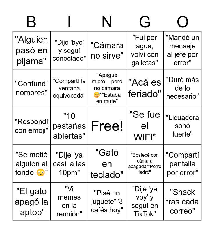 This bingo card has a free space and 34 words: "Zoom se congeló otra vez", "Dije 'ya voy' y seguí en TikTok", "Cerré sin guardar 😩", "Tomé café sin darme cuenta", "Se metió alguien al fondo 😳", "Compartí la ventana equivocada", "Mandé un mensaje al jefe por error", "El gato apagó la laptop", "Dije 'bye' y seguí conectado", "Olvidé la cámara prendida", "Apagué micro... pero no cámara 😅""Estaba en mute", "Cámara no sirve", "¿Quién tiene el control?", "Pudo ser un mail", "Se fue el WiFi", "Duró más de lo necesario", "Vi memes en la reunión", "Respondí con emoji", "Dije 'ya casi' a las 10pm", "Bostecé con cámara apagada""Perro ladró", "Gato en teclado", "Niño gritó algo raro", "Alguien pasó en pijama", "Licuadora sonó fuerte", "Pisé un juguete""3 cafés hoy", "Snack tras cada correo", "Fui por agua, volví con galletas", "Revisé algo rápido = 2 horas""Huso horario mal", "Acá es feriado", "Confundí nombres", "Reunión en dos idiomas""Escribí mientras hablaba", "10 pestañas abiertas", "Compartí pantalla por error" and "Mensaje al chat equivocado".