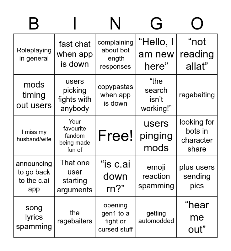 This bingo card has a free space and 24 words: That one user starting arguments, the ragebaiters, copypastas when app is down, song lyrics spamming, “not reading allat”, Roleplaying in general, mods timing out users, fast chat when app is down, users pinging mods, “is c.ai down rn?”, “the search isn’t working!”, I miss my husband/wife, emoji reaction spamming, plus users sending pics, users picking fights with anybody, getting automodded, looking for bots in character share, complaining about bot length responses, ragebaiting, Your favourite fandom being made fun of, “hear me out”, announcing to go back to the c.ai app, “Hello, I am new here” and opening gen1 to a fight or cursed stuff.