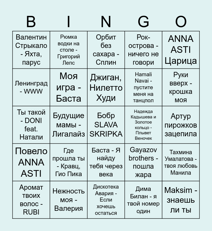 This bingo card has 25 words: Повело ANNA ASTI, Нежность моя - Валерия, Бобр SLAVA SKRIPKA, Дима Билан - я твой номер один, ANNA ASTI Царица, Валентин Стрыкало - Яхта, парус, Рюмка водки на столе - Григорий Лепс, Орбит без сахара - Сплин, Надежда Кадышева и Золотое кольцо - Плывет Веночек, Тахмина Умалатова - твоя любовь Манила, Ленинград - WWW, Моя игра - Баста, Дискотека Авария - Если хочешь остаться, Gayazov brothers - пошла жара, Руки вверх - крошка моя, Аромат твоих волос - RUBI, Будущие мамы - Лигалайз, Джиган, Нилетто Худи, Hamali Navai - пустите меня на танцпол, Артур пирожков зацепила, Ты такой - DONI feat. Натали, Где прошла ты - Кравц, Гио Пика, Баста - Я найду тебя через века, Рок-острова - ничего не говори and Maksim - знаешь ли ты.