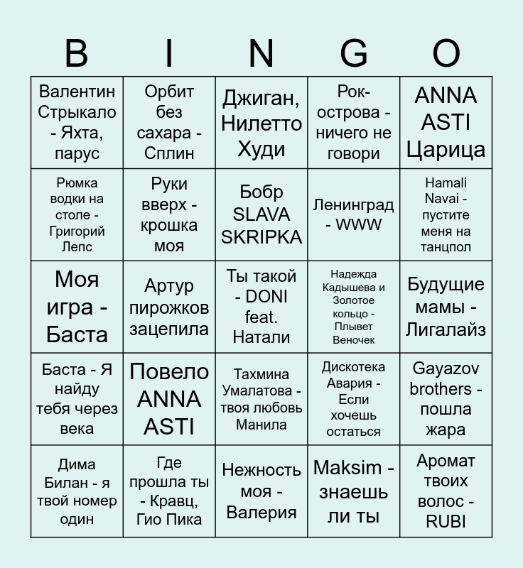 This bingo card has 25 words: Повело ANNA ASTI, Нежность моя - Валерия, Бобр SLAVA SKRIPKA, Дима Билан - я твой номер один, ANNA ASTI Царица, Валентин Стрыкало - Яхта, парус, Рюмка водки на столе - Григорий Лепс, Орбит без сахара - Сплин, Надежда Кадышева и Золотое кольцо - Плывет Веночек, Тахмина Умалатова - твоя любовь Манила, Ленинград - WWW, Моя игра - Баста, Дискотека Авария - Если хочешь остаться, Gayazov brothers - пошла жара, Руки вверх - крошка моя, Аромат твоих волос - RUBI, Будущие мамы - Лигалайз, Джиган, Нилетто Худи, Hamali Navai - пустите меня на танцпол, Артур пирожков зацепила, Ты такой - DONI feat. Натали, Где прошла ты - Кравц, Гио Пика, Баста - Я найду тебя через века, Рок-острова - ничего не говори and Maksim - знаешь ли ты.